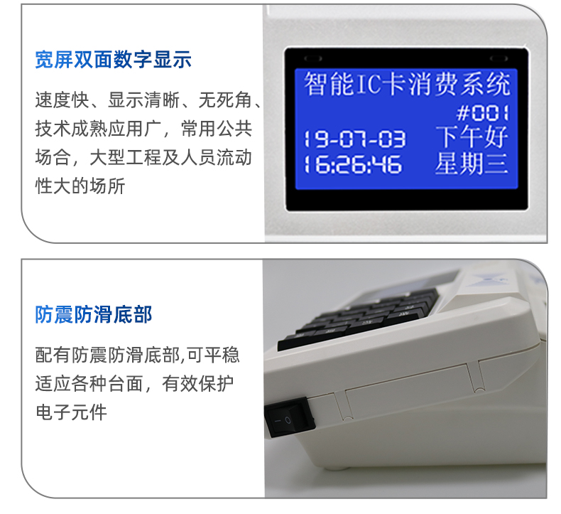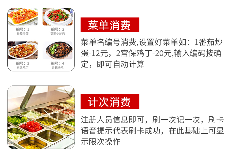 ● 两个显示屏同步显示,购饭者和售饭者同时看到消费打卡信息。